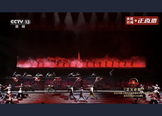 “在《正义必胜》中,视觉创作始终围绕两个核心展开,既要在史诗性的叙事中建立鲜明的舞台形象,也要用新的技术催生全新的舞台语言。”任冬生说,晚会采用了与历史对话的讲述方式,舞台技术也成为叙事的手段之一,“我们不想堆砌技术,而让舞美、灯光、多媒体、服装等所有部门获得全新的叙事能力,打破舞台物理空间的限制,不是单纯地写实,而是完成对历史的再现和与当下的对话,实现史诗化的全景叙事。”