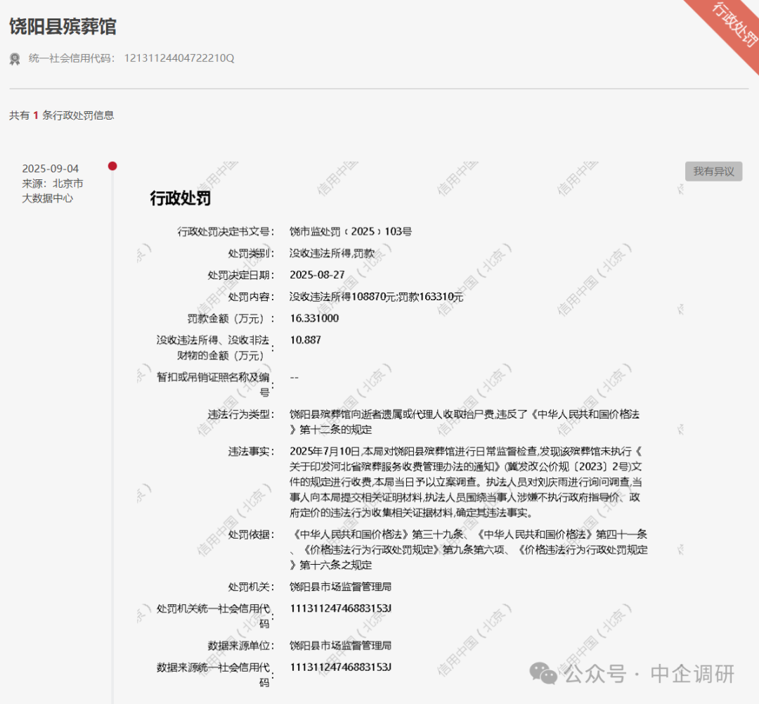 信用中国显示:8月27日,河北省饶阳县市场监督管理局下达行政处罚决定书[饶市监处罚(2025)103号],对饶阳县殡葬馆向逝者遗属或代理人收取抬尸费的违法行为,作出没收违法所得108870元及罚款163310元的行政处罚。