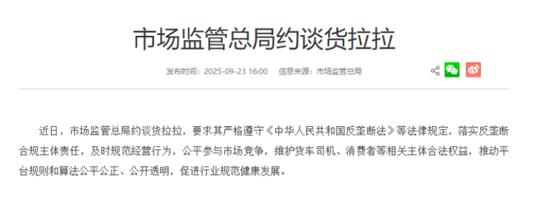 红星资本局9月23日消息 今日,国家市场监督管理总局发布消息。近日,市场监管总局约谈货拉拉,要求其严格遵守《中华人民共和国反垄断法》等法律规定,落实反垄断合规主体责任,及时规范经营行为,公平参与市场竞争,维护货车司机、消费者等相关主体合法权益,推动平台规则和算法公平公正、公开透明,促进行业规范健康发展。