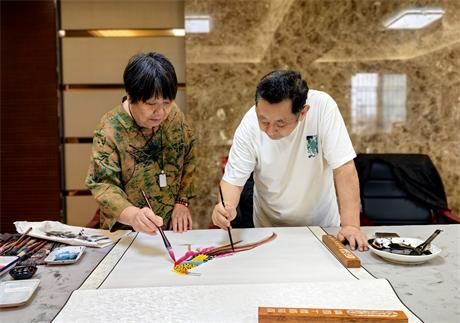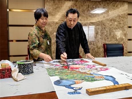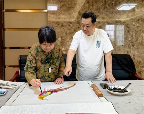 在画室,他们共同度过无数个日夜。清晨的微光透过木格窗,洒在宣纸上,也洒在他们创作的身影上。有时,窗外传来几声鸟鸣,为这安静的画室增添了几分生机。对面的赵桂香用纤细的指尖揉搓着颜料,将钛白与曙红在青花碟中交融,调配出如朝霞般绚烂的胭脂色,为笔下的牡丹增添娇艳。她专注的神情,仿佛整个世界只剩下她和眼前的画作。